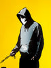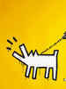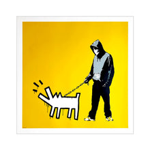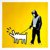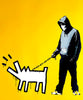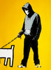 The present work depicts a hooded man with dark clothing and a bandana hiding his face, a visual motif recurrent in Banksy’s stencil work and meant to signify a British disaffected youth. The man’s menacing appearance is contrasted by his casual hand-in-the-pocket posture and his cartoon dog, who is chained and barking.