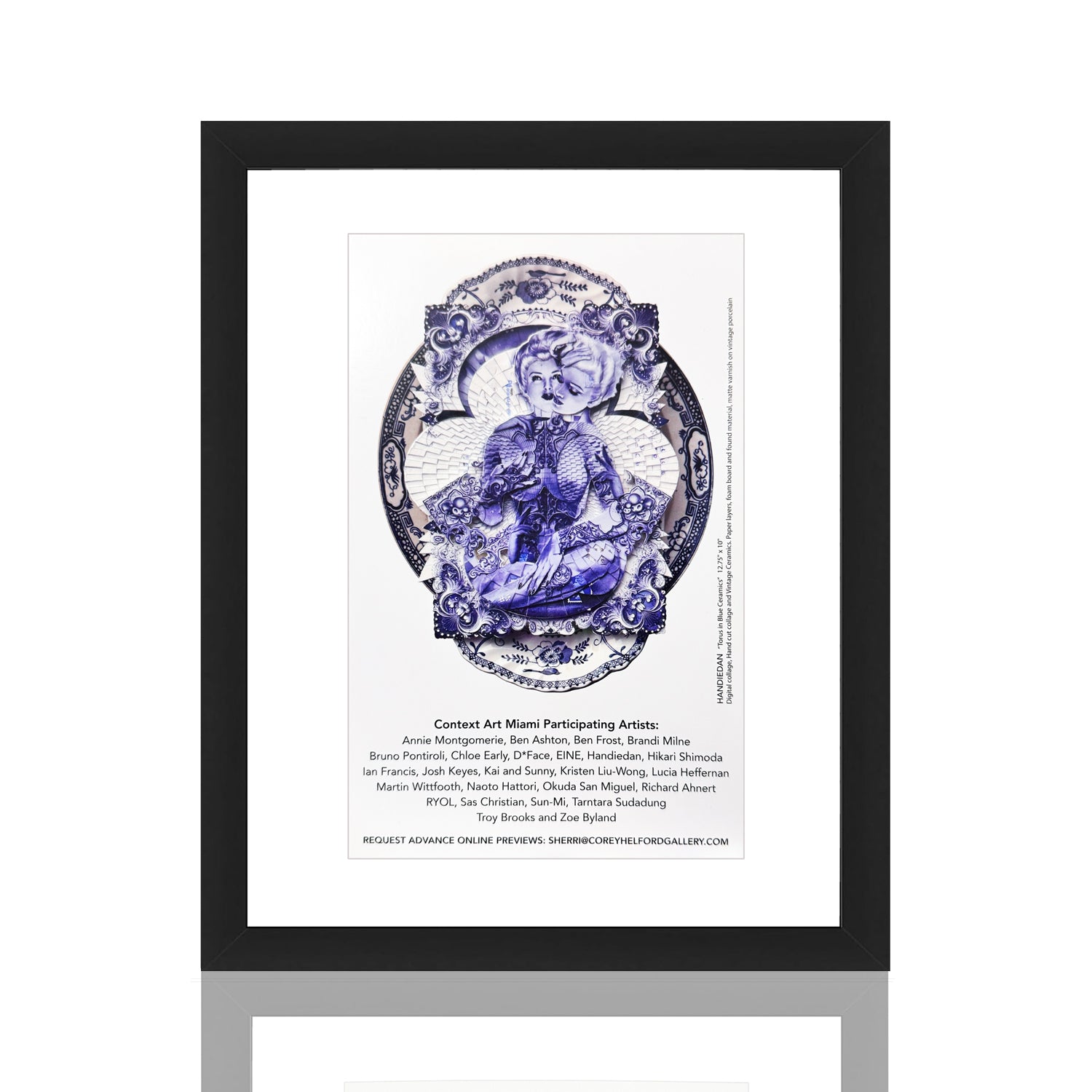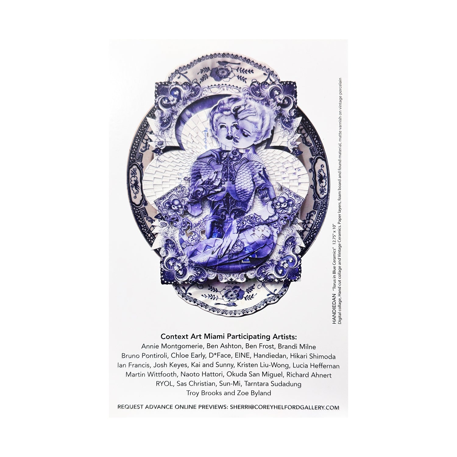 Within the context of the fair, Handiedan’s work offered a moment of visual stillness and precision amid the spectacle of Miami Art Week. Its ornate restraint and historical references contrasted sharply with more overtly gestural or pop-driven works, inviting viewers to slow down and engage closely with detail and symbolism. As both a collectible postcard and documentation of the exhibition, this piece serves as a lasting record of Handiedan’s presence at Context Art Miami 2023—capturing her ability to merge old-world craftsmanship with contemporary conceptual art.