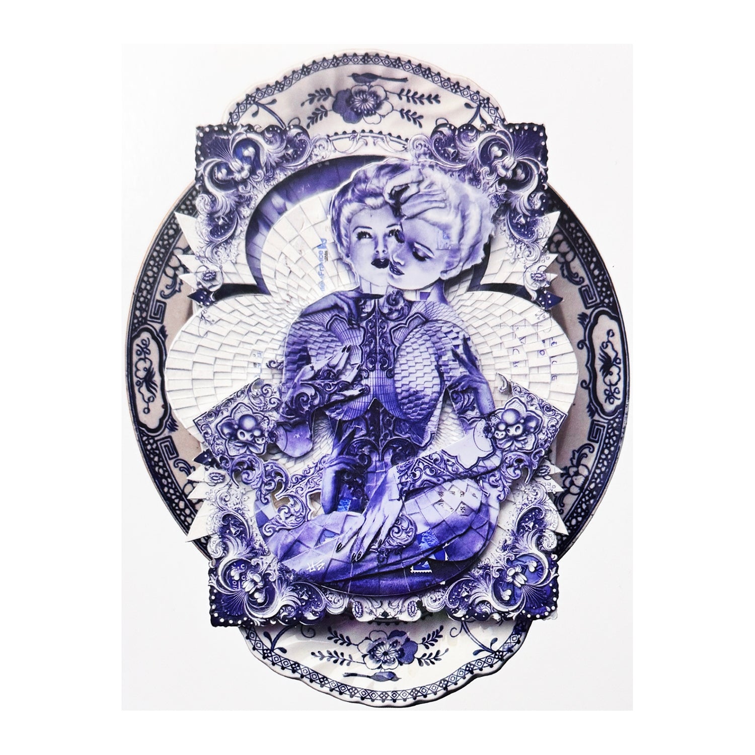 The work featured on this postcard exemplifies Handiedan’s signature visual language, where human figures are embedded within elaborate frameworks of ceramic patterns, ornamental borders, and architectural geometry. Rendered primarily in cobalt blue tones reminiscent of Delftware and traditional porcelain, the composition evokes both fragility and permanence. The figure appears suspended within an ornate structure, blurring distinctions between body, object, and environment. This fusion reflects Handiedan’s ongoing exploration of identity, control, and transformation—how individuals are shaped by cultural systems, aesthetics, and inherited histories.
