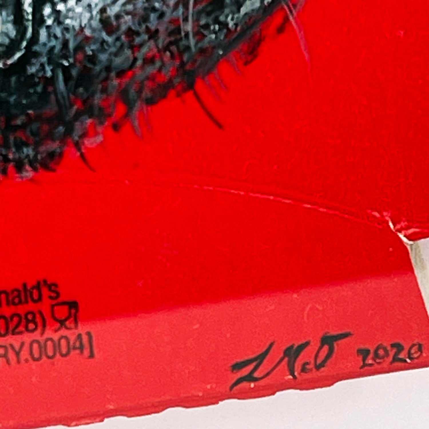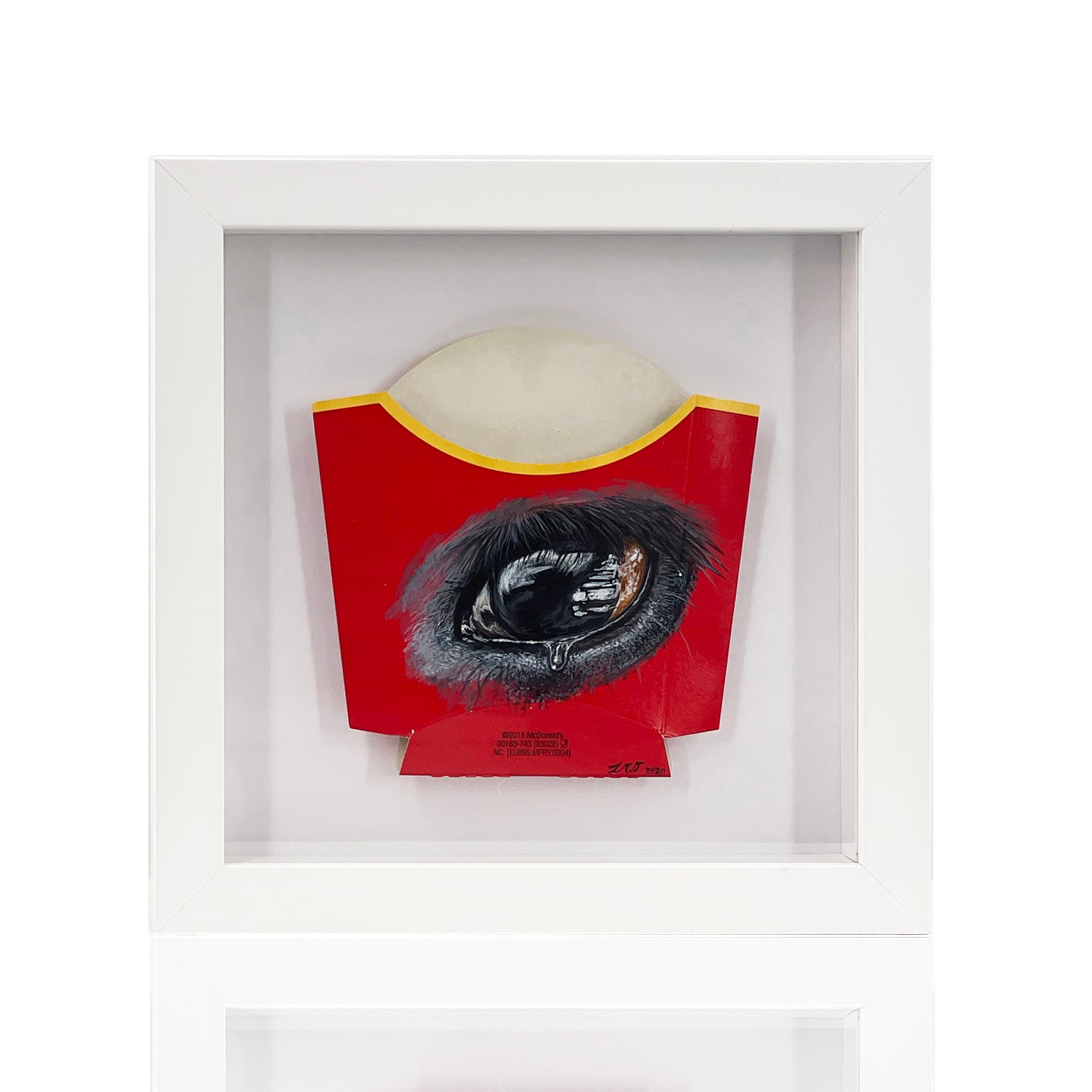 Stunningly realistic, hand-painted tearful Cow eye on real "McDonald's" french fries packaging.