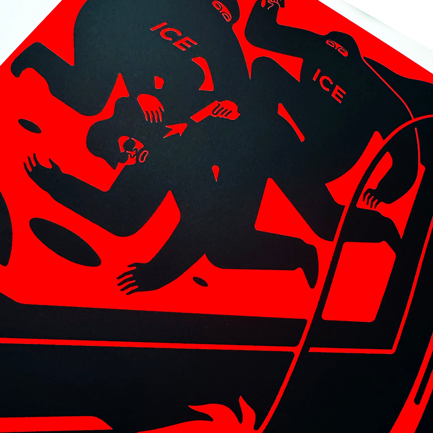 Outside, masked ICE officers wrestle a man to the ground in broad daylight. The boundary between private life and state force is separated by a simple pane of glass.