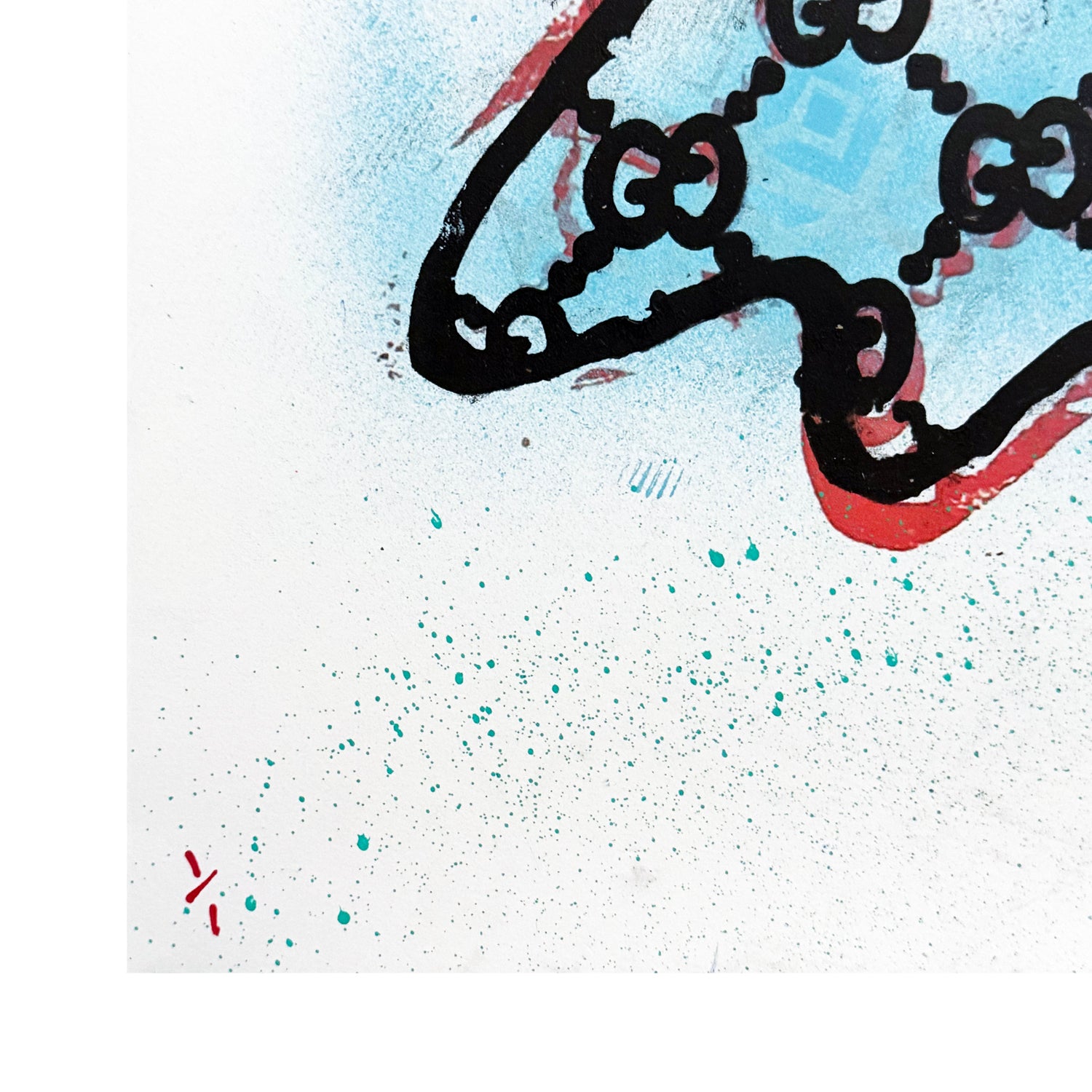 What sets this piece apart is its 1/1, hand-embellished nature—no two works are alike. Each gesture, splatter, and tonal variation is applied by the artist, transforming the print into a unique hybrid of street art spontaneity and fine art craftsmanship. This direct artist intervention brings an added layer of authenticity and energy, echoing the immediacy of Andrew’s early street work while maintaining the polish of his gallery practice.