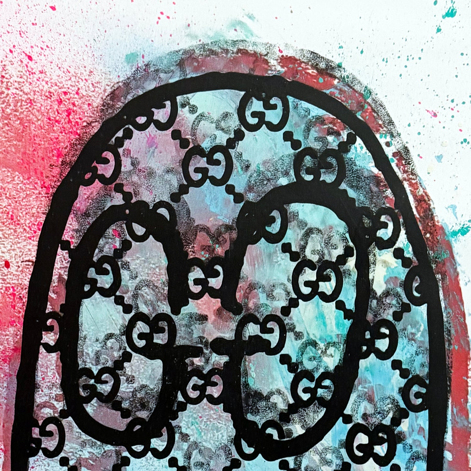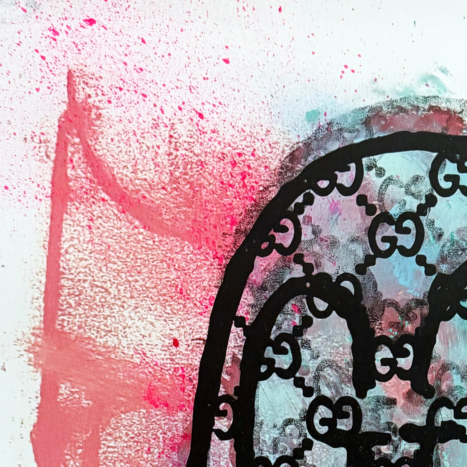 'Moon Mist' (2020) captures Trevor Andrew’s iconic “Classic Ghost” at its most raw and expressive—elevating his signature motif into a truly one-of-a-kind statement piece. Set against a dynamic, hand-embellished background of layered sprays, drips, and atmospheric color, the ghost emerges almost like a fleeting presence—part graffiti, part apparition. The interplay of soft blues, pinks, and textured overspray gives the work a sense of movement and depth, contrasting beautifully with the bold, unmistakable Gucci monogram that defines Andrew’s visual language.