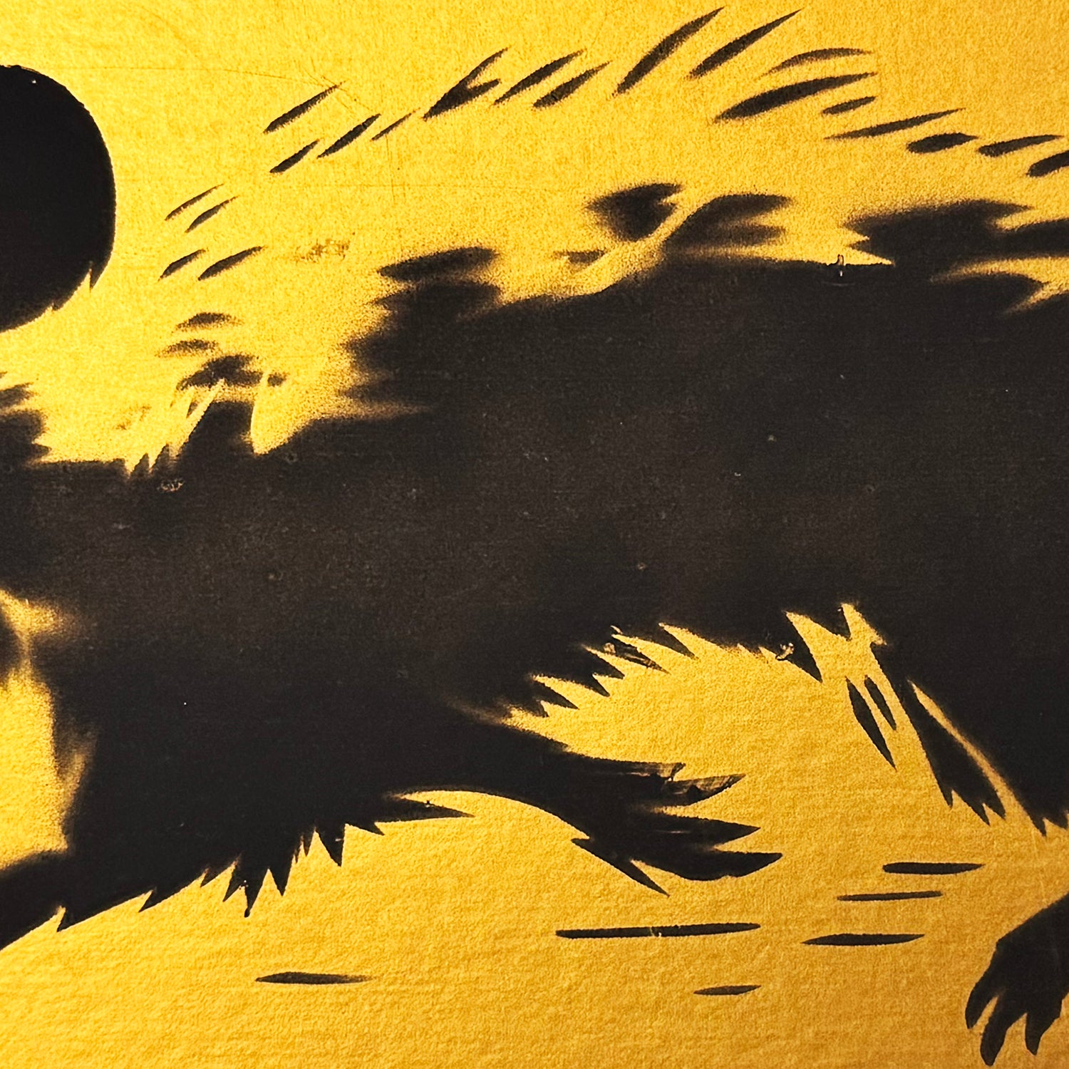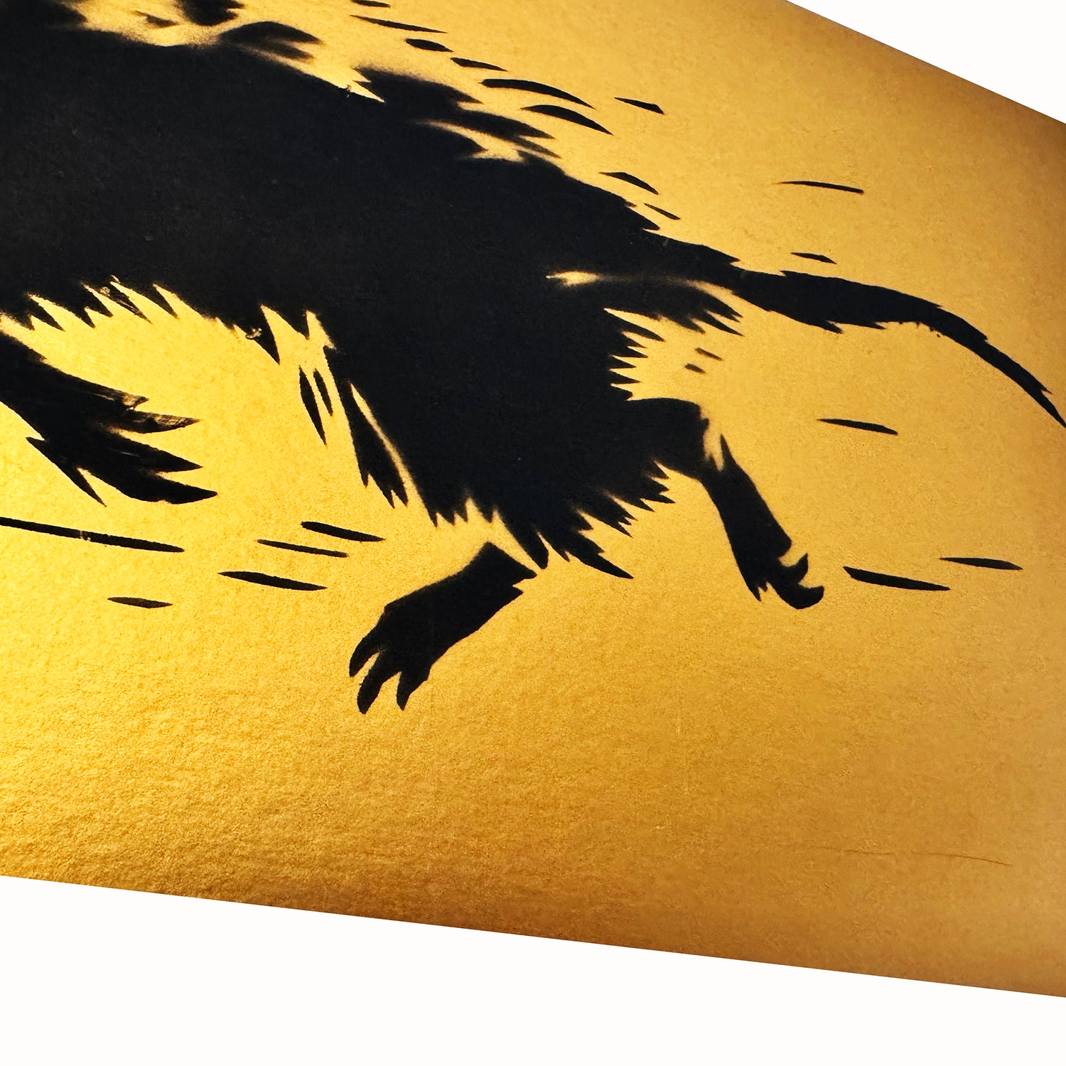 Hand-painted, single color (black) spray paint/stencil on metallic gold cardboard with white backing.