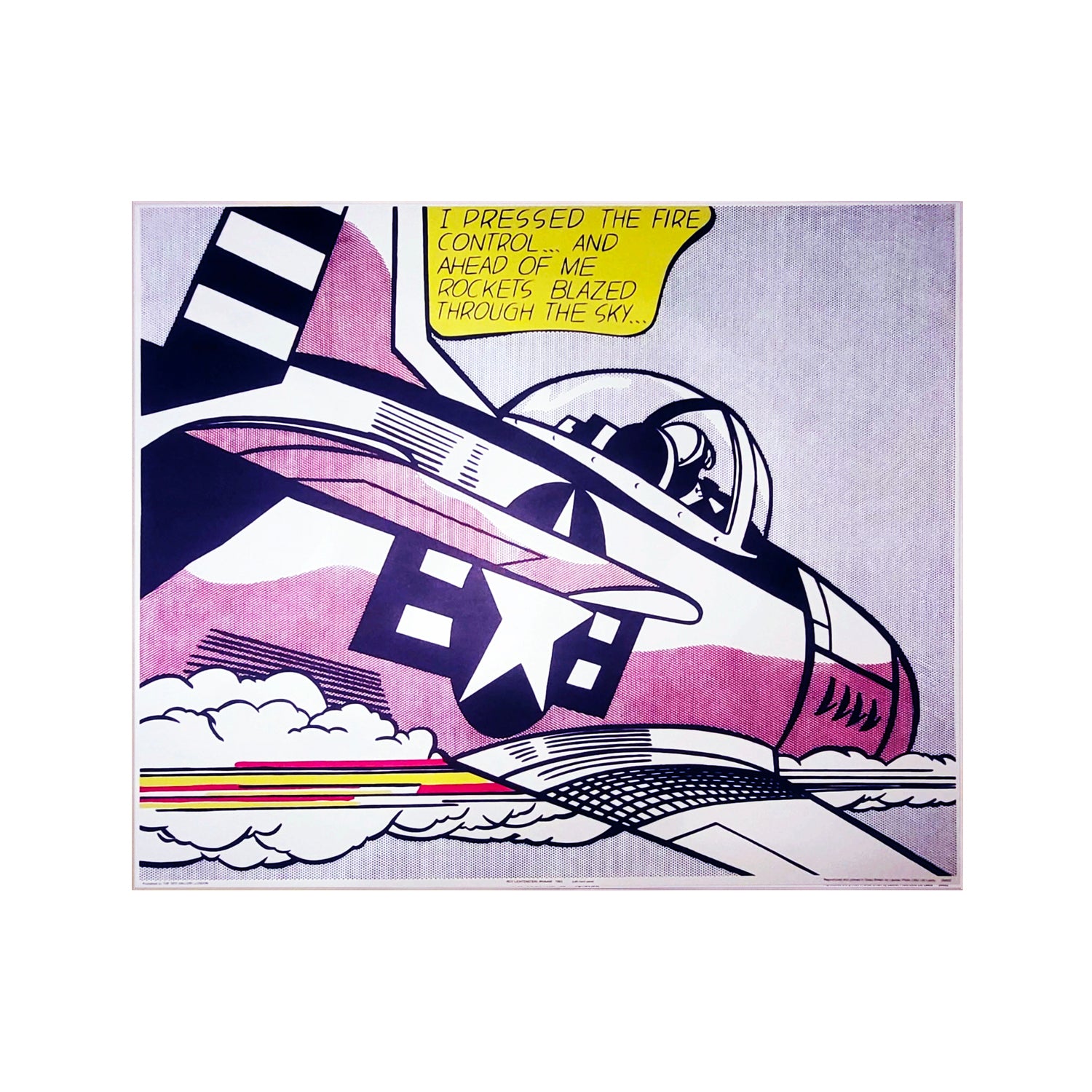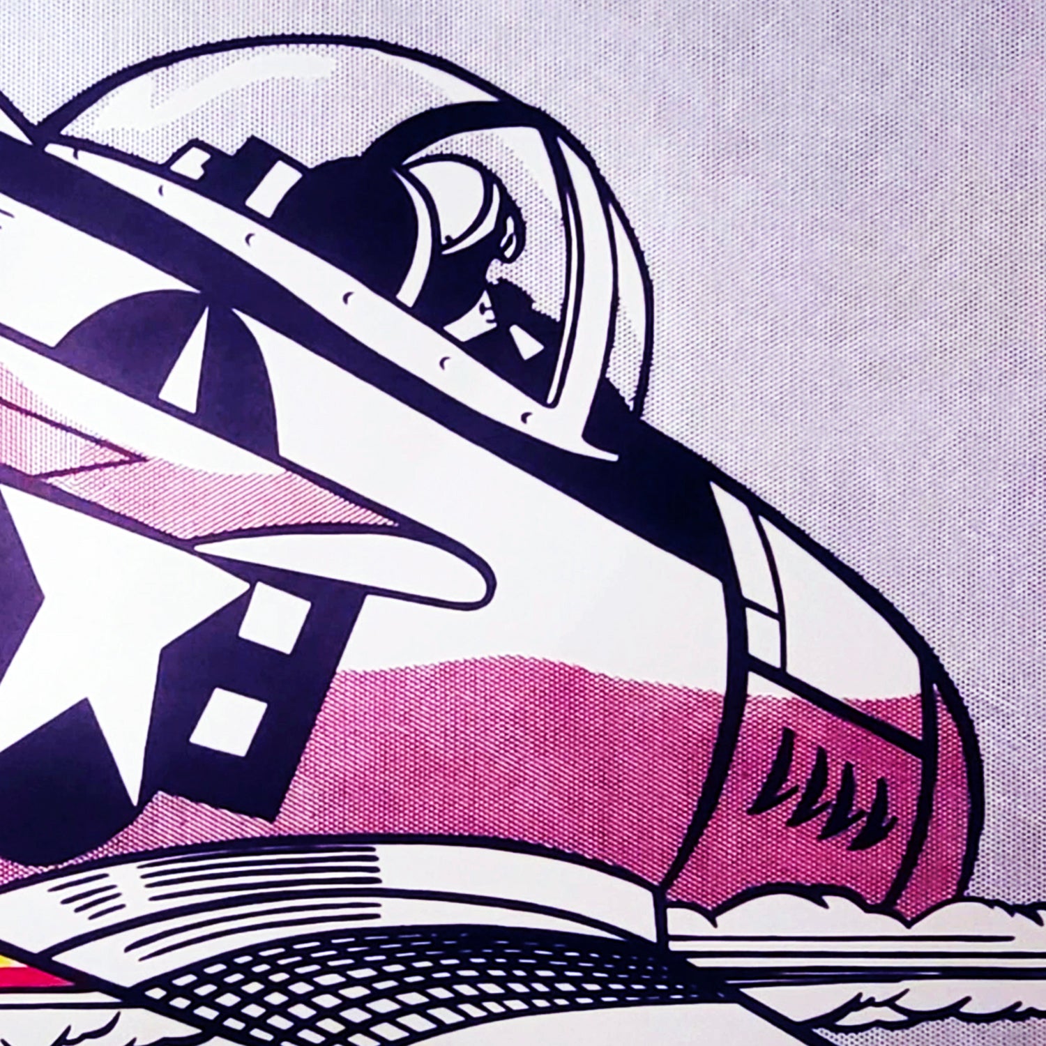 Whaam! is one of Roy Lichtenstein’s most famous and ambitious prints, originally created in 1963 as a monumental two-panel painting (diptych). The image depicts a fighter jet firing a rocket that explodes an enemy aircraft in a burst of dramatic color and sound effect text. Lichtenstein borrowed this imagery directly from a 1950s war comic book, stripping it of narrative context and isolating the explosive moment in a flattened, graphic style that mirrors commercial printing.