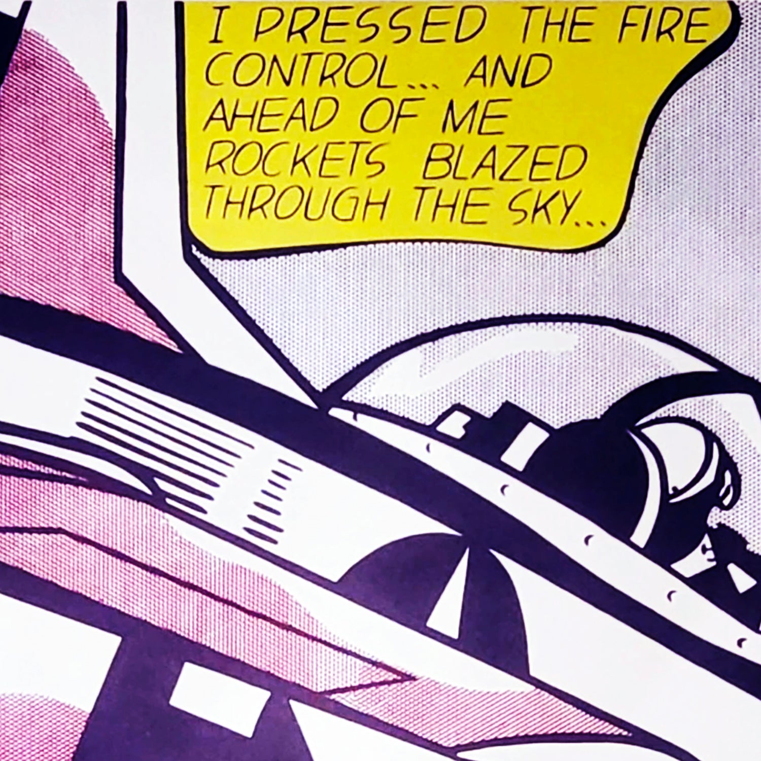 Stylistically, Whaam! exemplifies Lichtenstein’s strategy of appropriation and transformation. By isolating this split-second moment of aerial combat and pairing it with the onomatopoeic exclamation “Whaam!”, he invites viewers to consider how violence is packaged and dramatized in mass media. The graphic impact is direct and immediate: the viewer doesn’t read a story, but feels a dramatic pop of action.